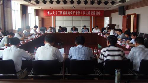 6月18日下午在永修吴城召开了有市政府,市人大城环委,市林业局、市水利局、市国土资源局、市环保局、市发改委、市财政局、市建设局、市交通运输局、市卫生局、市旅游局、市渔政局等单位参加的汇报座谈会。会上,副市长赵伟代表市政府向省人大检查组汇报了九江市贯彻实施《江西省湿地保护条例》的情况。